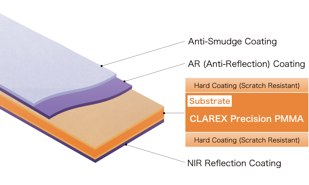 Anti-Reflection gives better transmission at VIS range NIR-Reflection blocks NIR to protect display.