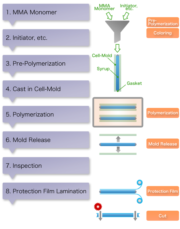 | Cell-Casting Method | Cast "Liquid MMA" directly into Cell-Mold. (Batch Process) ⇒ Suitable for High-Mix/Low-Volume Production. |