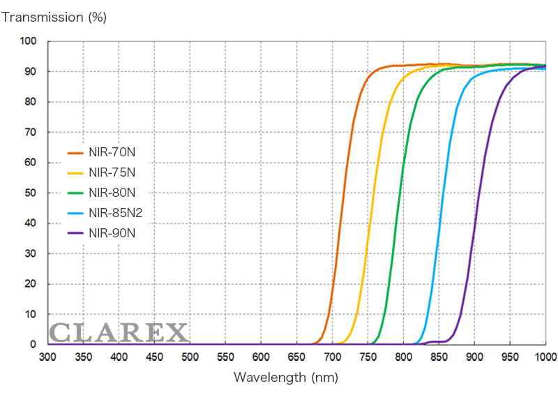 CLAREX NIR Filter transmits infra-red rays and absorbs visible rays. There are 5 types of infra-red filters which transmit through the ranges of 670nm to 860nm.