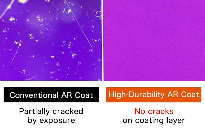 The highly durable Anti-Reflection coating with improved sea-water resistance and sunshine resistance compared to conventional AR.