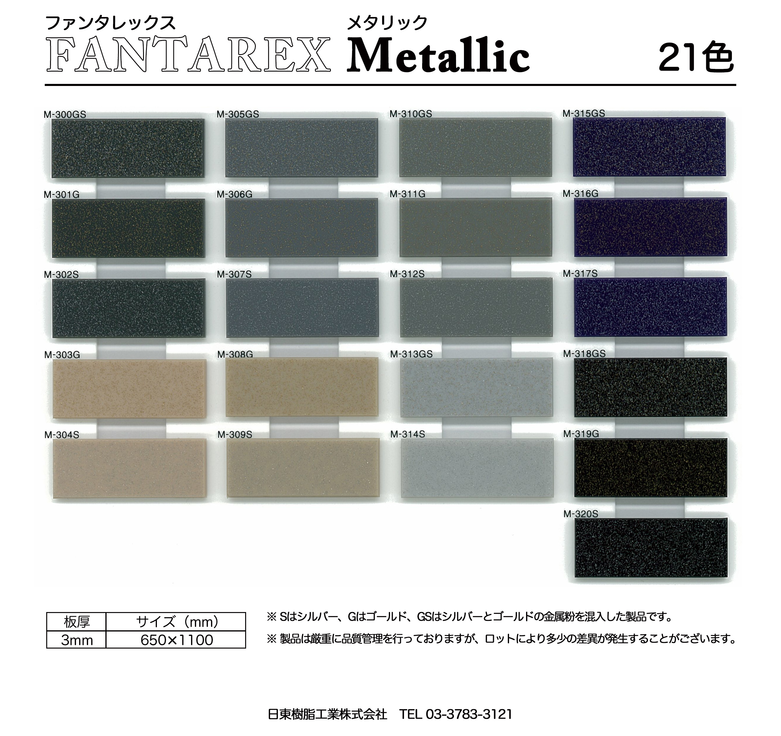 メタリックは、当社独自の製法にて金属粉を混入させたアクリル板です。Sはシルバー、Gはゴールド、GSはシルバーとゴールドを入れています。照明によってより豪華な風合いを演出することができます。M-315GS~M-317Sは青を、M-318GS~M-320Sは黒を基材にし、シャープな感覚のメタリック調を表現しております。